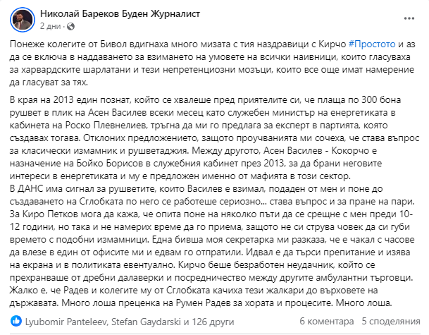 В края на 2013 един прочут, който се хвалеше пред приятелите си, че заплаща по 300 бона подкуп в плик на Асен Василев всеки месец като длъжностен министър на енергетиката в кабинета на Роско Плевнелиев, потегли да ми го предлага за специалист в партията, която създавах тогава. Отклоних предлагането, тъй като изследванията ми сочеха, че става въпрос за типичен лъжец и рушветаджия.