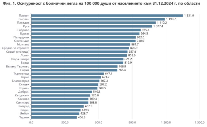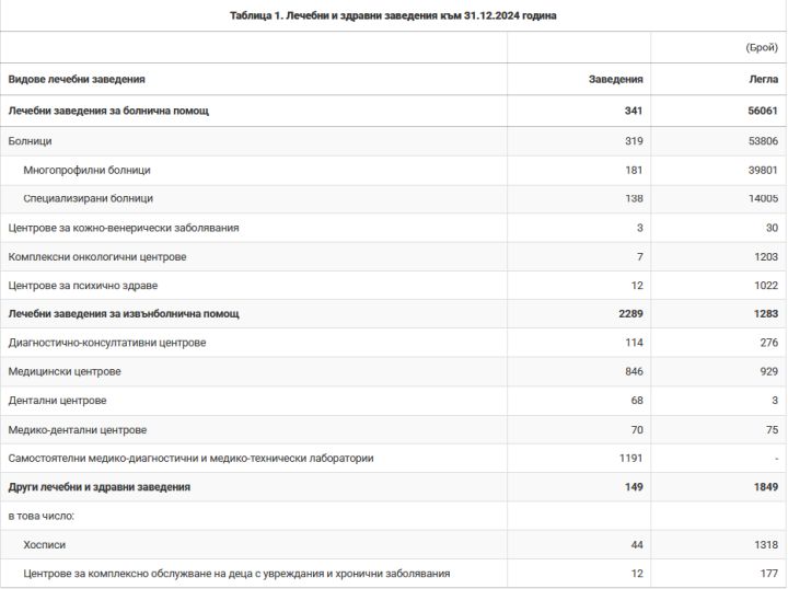 В края на 2024 година в страната действат 341 заведения за болнична помощ с 56 061 кревати. В съпоставяне с миналата година броят на заведенията остава неизменен, а леглата в тях се усилват с 337, или с 0.6%. Това сочат данните на Националния статистически институт (НСИ) за предходната година.