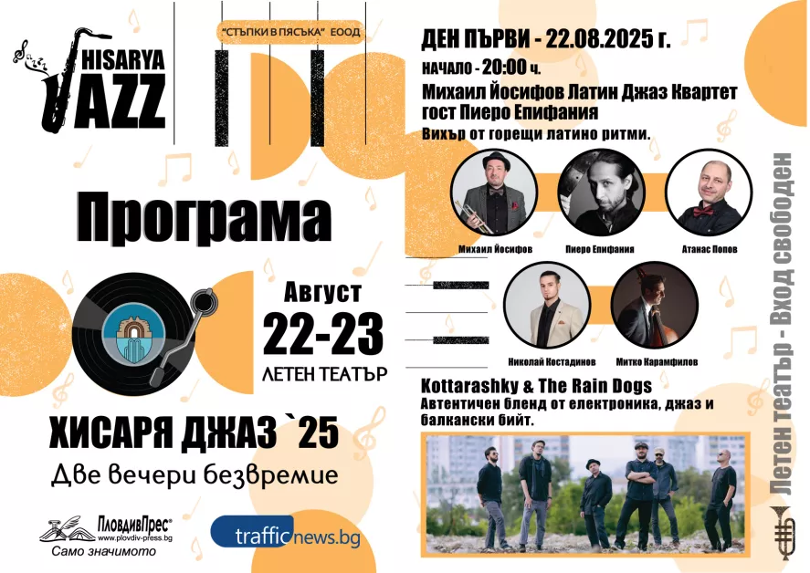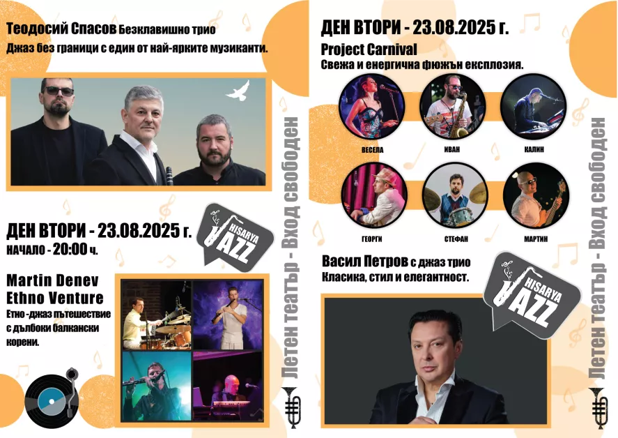 На 22 и 23 август Летният спектакъл в Хисаря ще бъде хазаин на първото издание на „ Хисаря Джаз “. Две вечери под намерено небе ще съберат музиканти от най-висока класа, а входът е свободен. Фестивалът се осъществя със съдействието на пианиста и композитор Мартин Денев и неговата културна организация „ Стъпки в пясъка “. Първата вечер ще бъде изпълнена с горещи ритми и импровизации – на сцената ще се изявят Михаил Йосифов Латин Джаз Квартет с посетител Пиеро Епифания, последвани от Kottarashky & The Rain Dogs, а финалът ще сложи Теодосий Спасов с плана „ Безклавишно трио “. Втората вечер ще стартира с Martin Denev Ethno Venture – музикално странствуване, в което джаз хармонии се преплитат с електронни текстури и балкански претекстове. Атмосферата ще се нажежи с Project Carnival – фънк и брас фюжън. Големият свършек е поверен на Васил Петров и Ангел Заберски, които ще омагьосат публиката с типичен джаз стандарти, суинг и сантиментални балади.