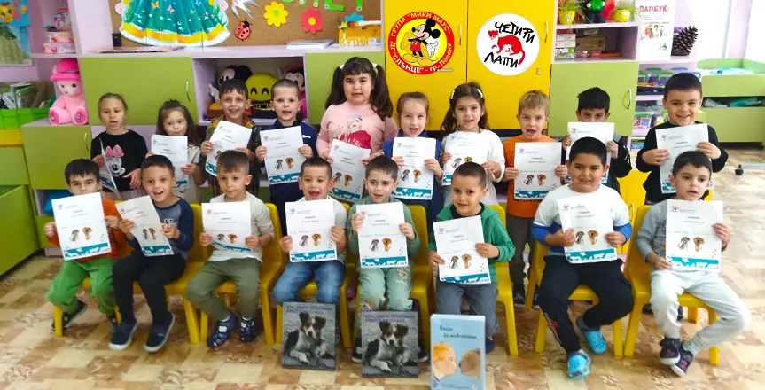 Посещението на Фондация „ Четири лапи “ е отличителна премия за трета подготвителна група „ Мики Маус “ по отношение на вътрешно-образователен план „ За животните с обич “, сбъднат в съдействие с деца, родители и учители. Реализираните планови действия са високо оценени и потвърждават хуманното отношение на нашите положителни деца, подкрепяни от родители и учители. Поздравления и награди получиха и педагозите на групата госпожа Алиева и госпожа Иванова. Фондацията изрече специфични благодарности и възторженостти за цялостната активност ориентирана към възпитаване на децата в грижа и обич към животни.