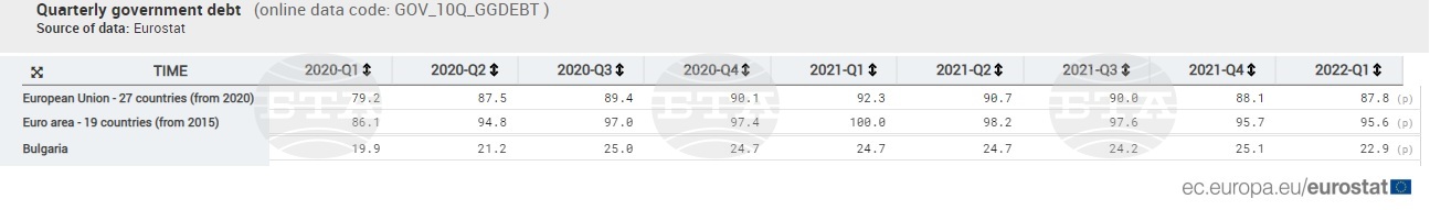 Слабото понижение на индикатора и в двете общности се дължи на нарастването на Брутният вътрешен продукт, което надвишава растежа на държавния дълг в безспорни стойности. През първите три месеца на 2022 година по отношение на същия интервал година по-рано съотношението държавен дълг към Брутният вътрешен продукт спада по-осезаемо, както в Европейски Съюз (от 92,3 на 100 на 87,8 на сто), по този начин и в еврозоната (от 100 на 95,6 на сто).