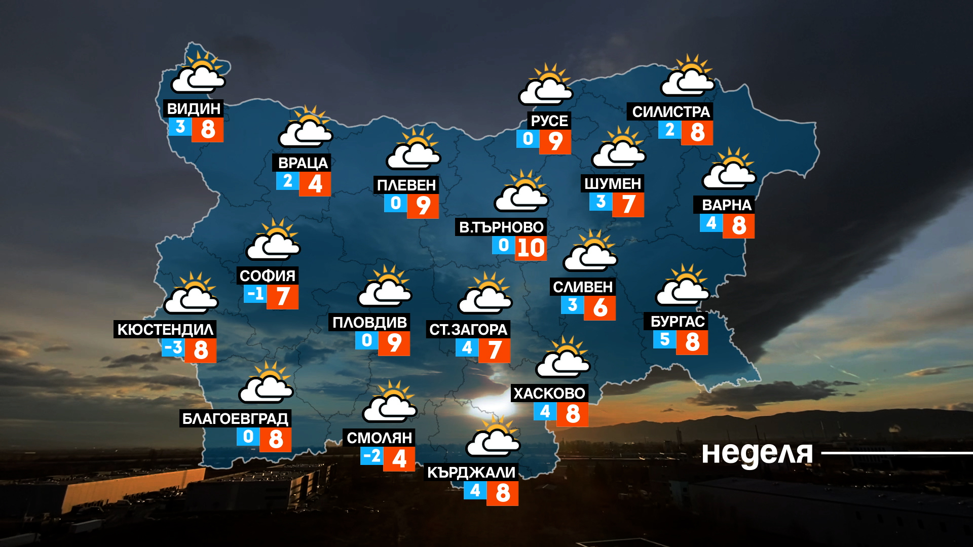 През нощта и в неделя облачността ще се раздра, на повече места в Западна и Централна България. В планините вятърът ще се усили следобяд. В най-топлата част на денонощието термометрите ще се движат в сходни граници – още веднъж сред 4 и 9-10 градуса.