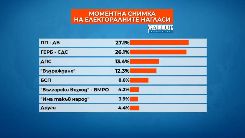 ГЕРБ резервира минимално преимущество с по-малко от % пред предизборната коалиция, като партията на Бойко Борисов се употребява с поддръжката на 25.6% от гласуващите, до момента в който обединяването сред „ Продължаваме промяната " и „ Демократична България " с 24.8% от гласуващите.