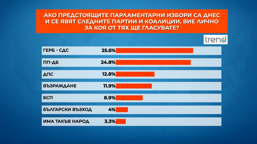 Третото място остава за Движение за права и свободи с 12.8%. „ Възраждане " доближава равнища от 11.9% измежду гласуващите. Пета в подредбата е Българска социалистическа партия с 8.9% от гласуващите. Реални шансове за парламентарно посланичество резервира " Български напредък " с 4% от гласуващите. Предизборната акция ще се окаже решаваща за партията на Стефан Янев. На отдалеченост от парламентарната преграда, само че с над 3% остава „ ИТН ". Опцията „ не поддържам никого ", която ще участва и в самия избирателен ден, продължава да събира относително висок % - 4.8 на 100 .