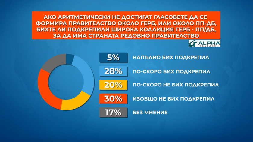 На въпрос, в случай че не стигат гласове, дали биха подкрепили необятна коалиция сред ГЕРБ- Съюз на демократичните сили и " Политическа партия и Демократична България ", 5% от запитаните дават отговор, че изцяло биха подкрепили, 28 % - че по-скоро биха подкрепили, 20 % - че по-скоро не биха подкрепили, 30 % - че въобще не биха подкрепили. Без мнение са 17% от запитаните. По-склонни да поддържат тази необятна коалиция са последователите на ГЕРБ-СДС, до момента в който болшинството от последователите на ПП- Демократична България остават дистанцирани.