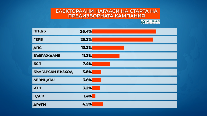 На старта на предизборната акция - слаба мотивация за присъединяване в изборите и паритет в борбата за първото място записва национално - представително изследване на " Алфа рисърч ".