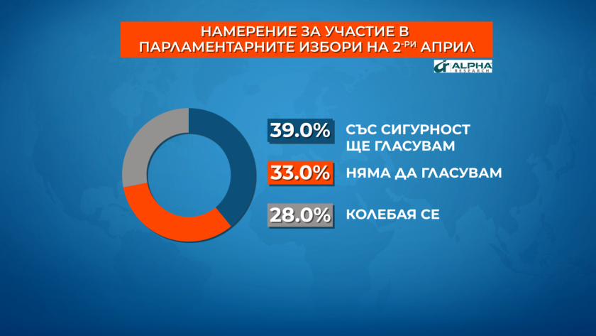 Декларираната на старта на акцията изборна интензивност е съизмерима с изборите през октомври. Ще гласоподават 39 % от българите , 33 на 100 няма да гласоподават, а 28 % се двоумят.