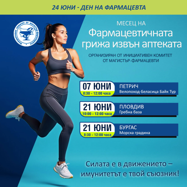 На 21 юни Инициативният комитет от магистър-фармацевти ще поддържа непрофесионалното организирано бягане от сдружението 5kmrun в пет огромни български града – София, Пловдив, Варна, Бургас и Плевен и се застъпва към насърчаването на тази нова просвета на мислене във връзка с бягането като част от здравословния метод на живот.