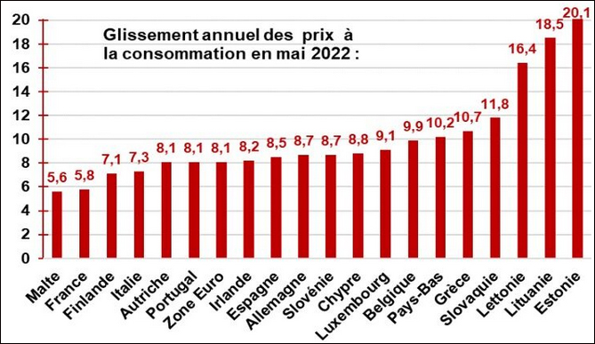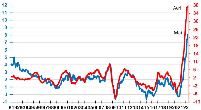 И въпреки че инфлационният напън е малко по-слаб във Франция, най-много с помощта на замразяването на някои цени на енергоносителите, има място за паника. Наистина през май покачването на потребителските цени на годишна база доближи 5,2%, което е исторически връх след 1985 година. Според европейските критерии инфлацията във Франция доближи 5,8%, което значи, че данните на Националния статистически институт на Франция (Insee) я подценяват. Освен това, през април повишаването на индустриалните цени във Франция е с 25% съгласно Insee, до момента в който по европейските критерии е 27,8%. Това ни кара да чакаме инфлация в границите на 8% през идващите месеци.