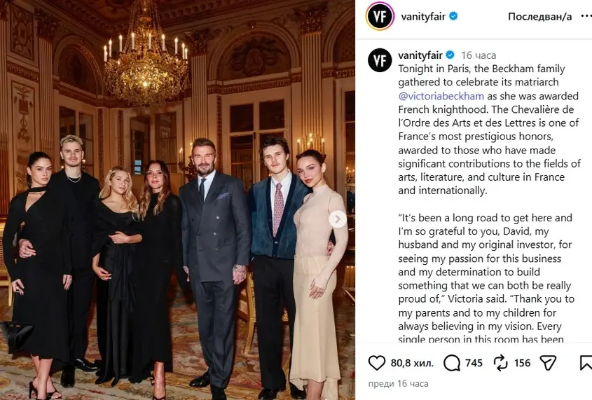В миг, в който името на семейство Бекъм е във фокуса на публичното внимание поради, Виктория Бекъм претърпя един от най-значимите си професионални триумфи. Звездата от поп групата на 90-те Spice Girls и основател на фешън линия беше удостоена със званието Chevalière на Ордена за изкуства на публична гала в Министерството на културата в Париж.
