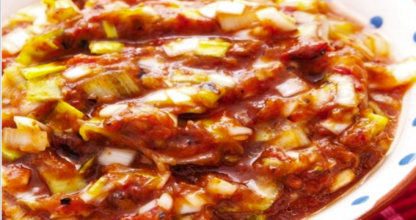 Празът (2 стръка) се нарязва на ситно и се смесва с намачканите с вилица печени белени червени чушки (8 бр) и доматеното пюре (8 с.л.).