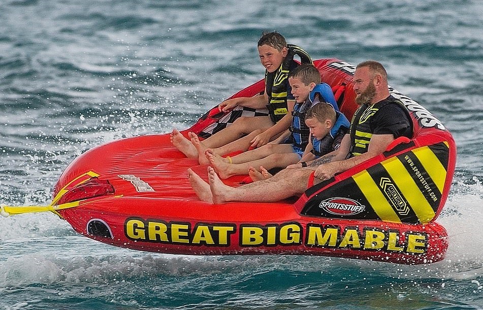 Междувременно Уейн забавляваше по-големите си деца, като се причисли към тях на надуваема лодка.