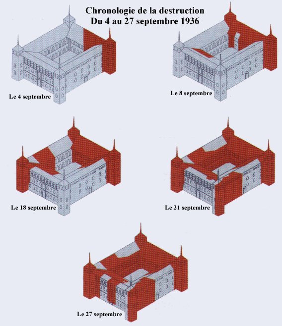 На 18 септември републиканците ще взривят кулата от югоизток. Сградата се пръска на части. След като бранителите отстъпват, първите червени знамена са сложени върху останаките. Зарядите в североизточната кула не се детонират. На 20 септември са готови 5 камиона с бензин в болничното заведение Санта Круз. Стените на Алкасар са наводнени с течността и за запалването са хвърляни гранати. Един от кадетите скача с противопожарен маркуч, с цел да изгаси пожара. Убит е, само че бранителите съумяват да приберат маркуча назад.