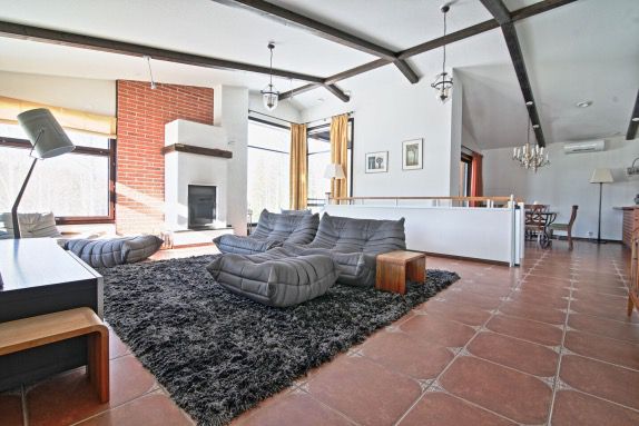 На първия етаж има огромна всекидневна с камина, там са и кухнята и спалните, а на партера са ситуирани огромна сауна и гараж за две коли и моторна шейна.