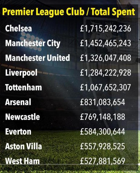 В навечерието на 25-ата годишнина от основаването на Премиър лийг в Англия взеха решение да обмислен кой клуб е похарчил най-вече пари за прехвърляния, откогато бе въведен този формат на шампионата. Сметките демонстрират, че преди всичко по този индикатор е Челси. " Сините от Лондон " са похарчили 1,7 милиарда паунда за нови попълнения от началото на сезон 1992/93 насам. Разбира се, огромните прехвърляния на " Стамфорд Бридж " започнаха след идването на съветския милиардер Роман Абрамович. Точната сума възлиза на 1 715 242 236. В нея влизат и покупко-продажбите от това лято, когато досега бяха платени 65 милиона за Алваро Мората, 40 млн. за Тиемуе Бакайоко и към 30 млн. за Антонио Рюдигер.