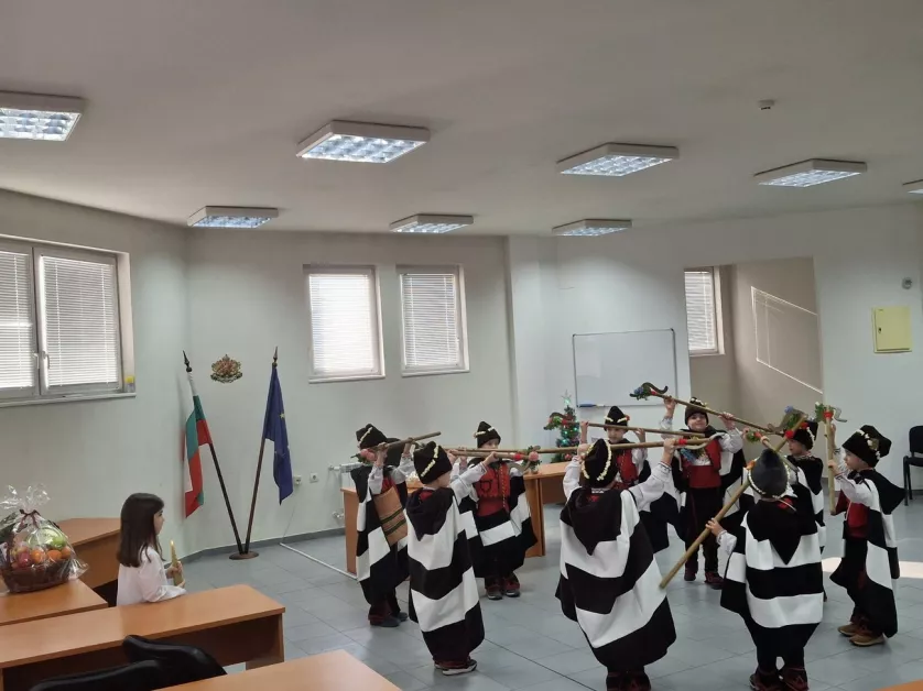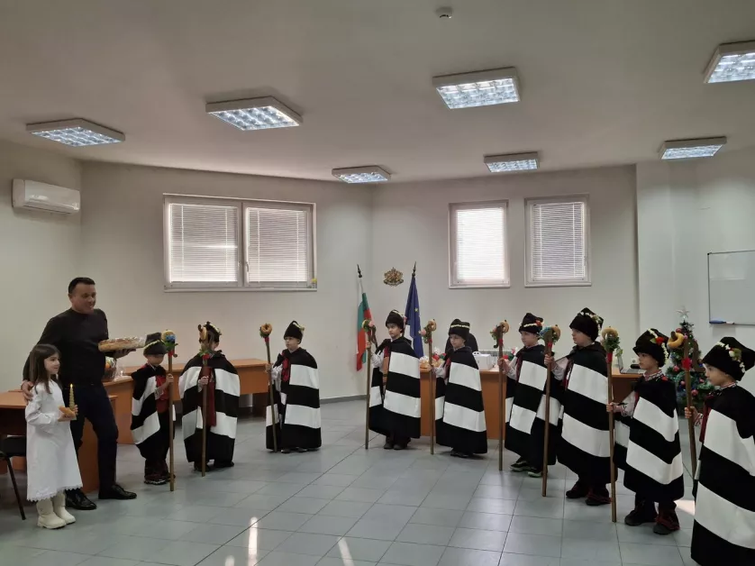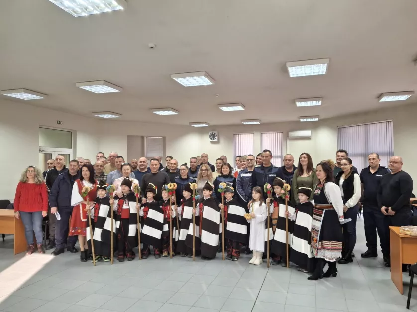 В навечерието на Рождество Христово чиновниците на реда посрещнаха скъпи посетители, пристигнали да им пожелаят здраве и благоденствие. „ Да ви е мирна службата! Да ви е лека годината! Да сте здрави като камък и бързи като вятър! Където ходите, положително да намирате и повече усмихнати хора да срещате! “ наричаше коледарската тайфа от 4 „ б “ група на ДГ „ Чайка “, потропвайки ритмично с украсените си геги. С пресъздаването на националния обред децата доставиха радостно неспокойствие и сътвориха същински празник за служителите на реда.