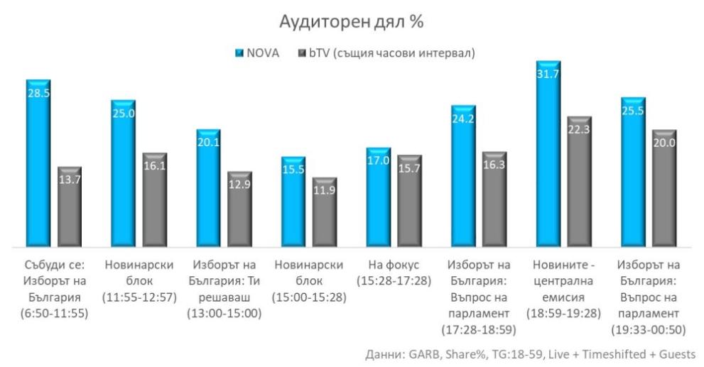 Нова Бродукастинг Груп даде опция на българите в страната и чужбина да проследят избора за народни представители в действително време на всички свои платформи – в телевизионния ефир на NOVA и NOVA NEWS, в ефира на радио NOVA NEWS, както и в уебсайтовете Nova.bg, Vesti.bg, Dariknews.bg. Бърз достъп до най-важните вести обезпечава и мобилното приложение на NOVA, с което потребителите могат да се осведомят за всичко значимо и настоящо. Новините на NOVA могат да бъдат открити и в Instagram, Twitter, Telegram и Viber.