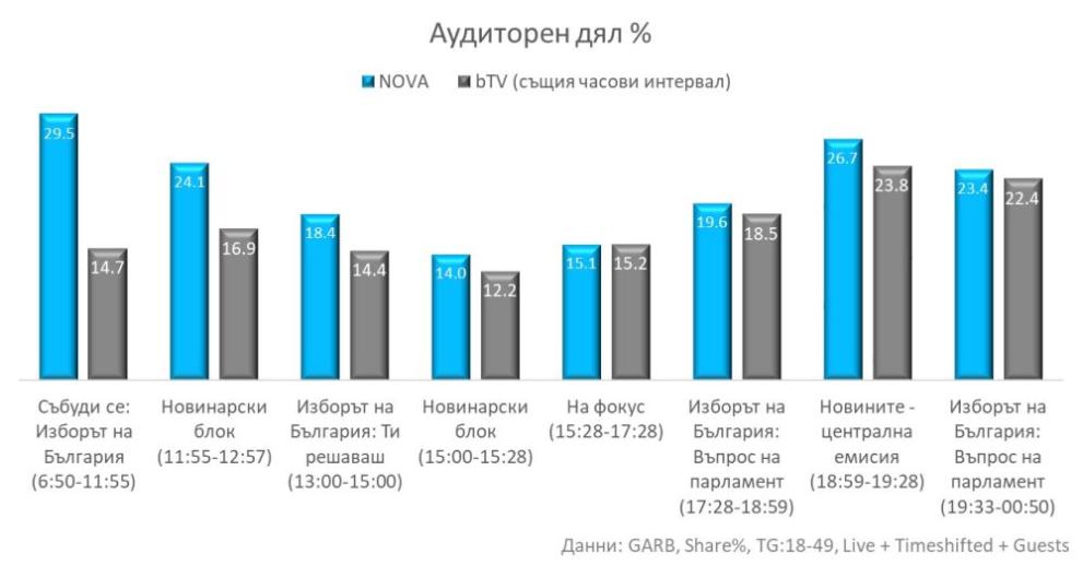 В неделя, 2 април, се организираха парламентарните избори за 49-ото Народно заседание на България. В деня на вота NOVA посвети близо 18 часа от програмата си на значимото събитие.