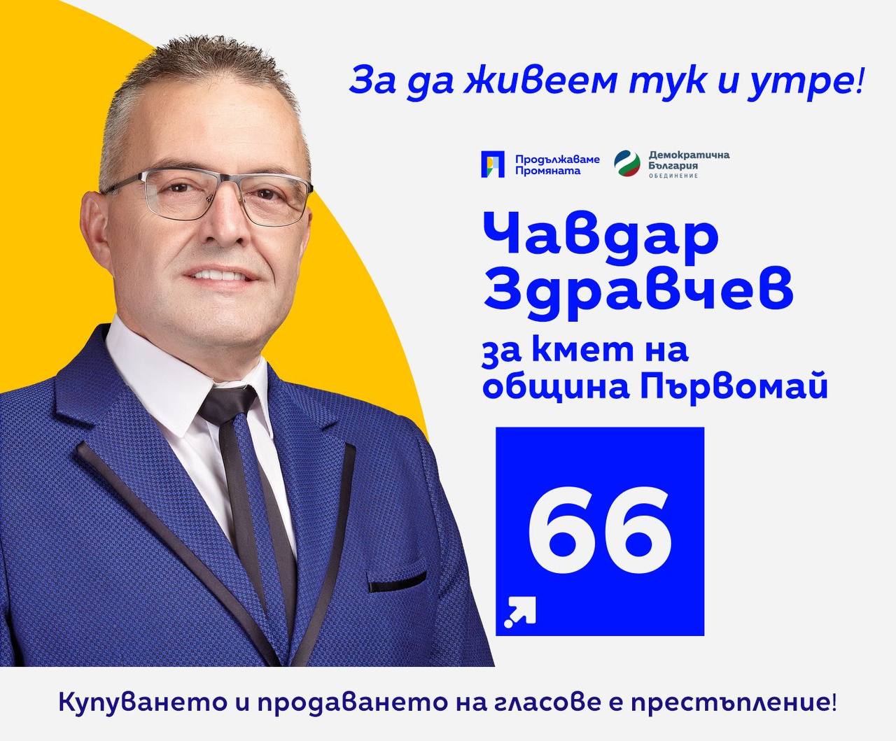 Силно имам вяра, че избирайки Чавдар Здравчев за кмет на град Първомай, бихме създали услуга на общината и бихме основали изискванията за модернизиране на общината, влизането и в крайник с доста от актуалните трендове (технологично и методически) освен от България, само че и от света. Надявам се хората да решат да му се доверят и му искам триумф! “