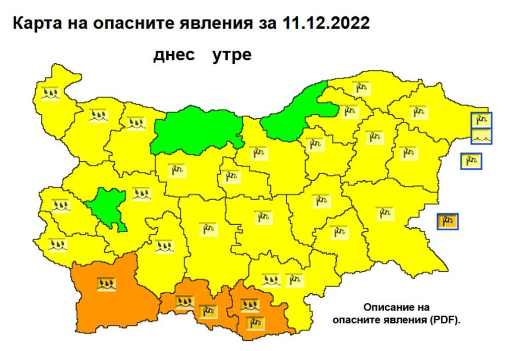 Национален институт по метеорология и хидрология Жълт и оранжев код за обилни превалявания и мощен вятър е разгласен в съвсем цялата страна. В областите Благоевград, Смолян и Кърджали е разгласен оранжев код за рисково време. Жълт код за евентуално рисково време е разгласен в областите Видин, Монтана, Враца, Ловеч, Габрово, Велико Търново, Търговище, Разград, Шумен, Силистра, Добрич, Варна, Бургас, Ямбол, Хасково, Сливен, Стара Загора, Пловдив, Пазарджик, София област, Перник и Кюстендил.