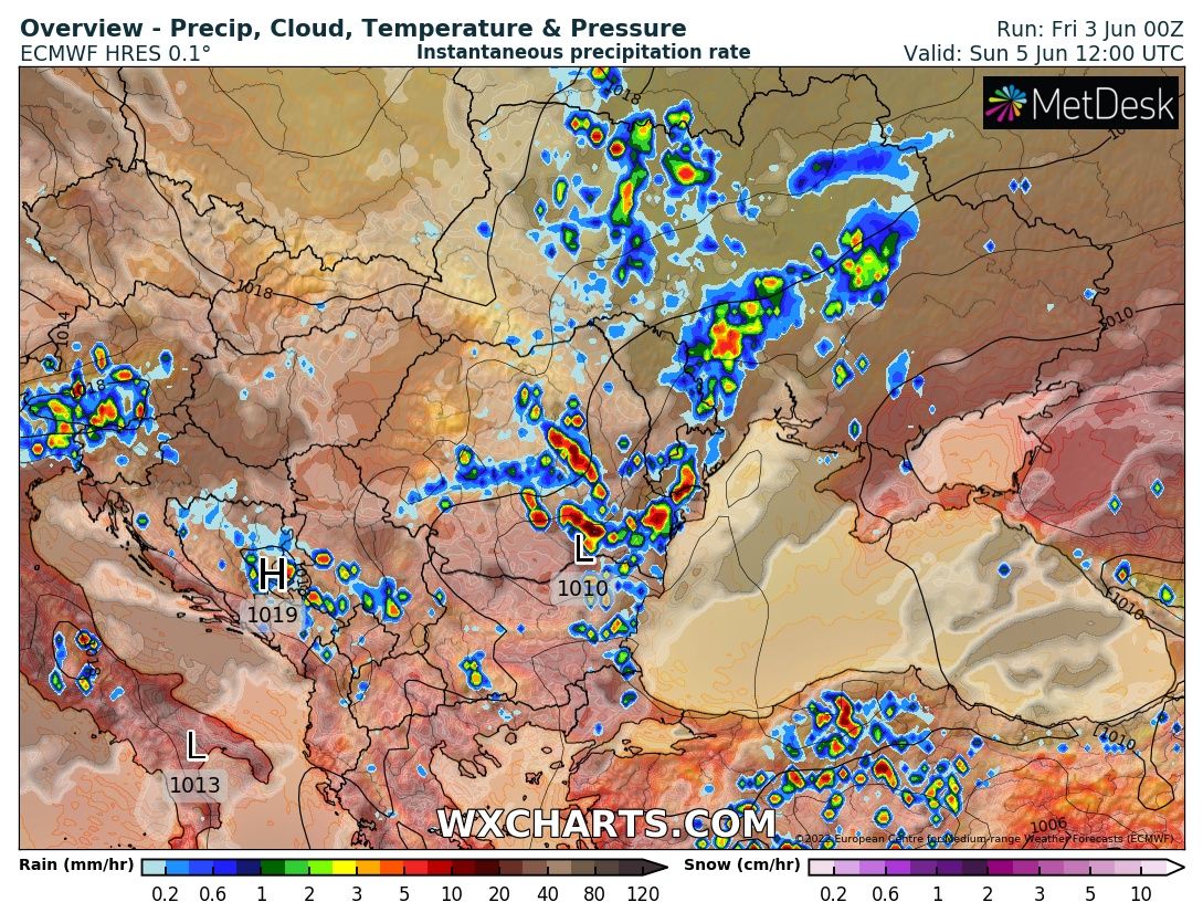 В неделя атмосферата ще е по-неустойчива в източната половина на страната, където в часовете следобяд и вечерта ще се развиват стихии с гръмотевична интензивност и заплаха от градушки. По-голяма възможност за всичко това има в Североизтока. През деня жегата и задухът следобяд ще се запазят, даже е допустимо термометрите следобяд да покажат и по-високи температури от съботните. Вятърът ще обърне посоката си от северозапад и ще е със по-силни пориви по Старопланинските била, в Дунавската низина и в Тракия.