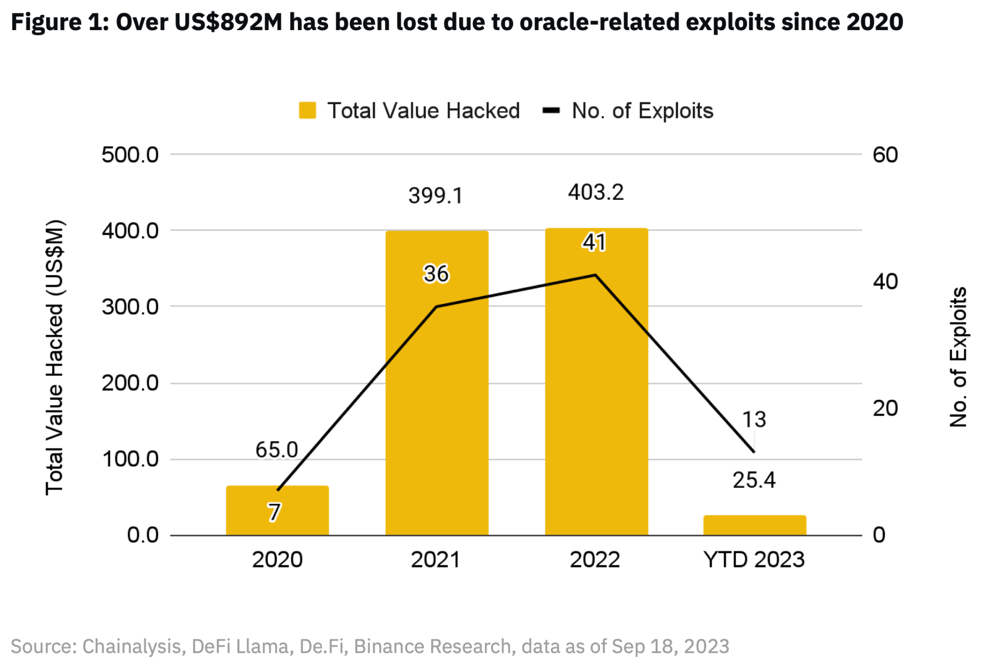 Според отчета общата стойност на хакнатите при експлойти, свързани с оракули, е скочила от $65 милиона през 2020 година до $399.1 милиона през 2021 година Размерът на загубите доближава своя връх от $403.2 милиона през 2022 година, преди да спадне до $25.4 милиона през 2023 година