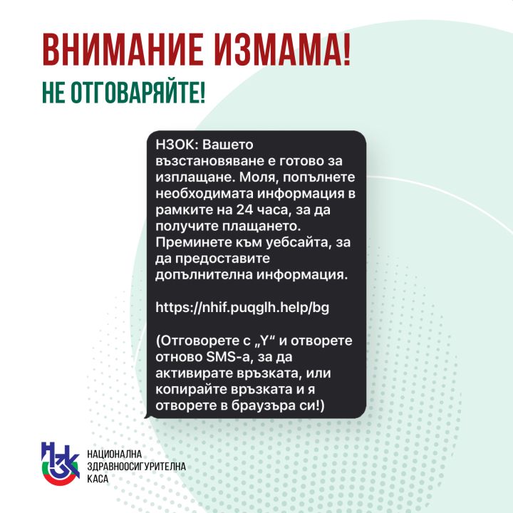 Обръщаме внимание, че при приемане на сходен вид sms със подозрително наличие, жителите могат да подават сигнали до НЗОК посредством телефон 080014800, както и да алармират органите на Министерство на вътрешните работи.