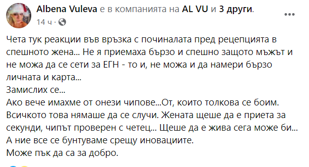 " Чета тук реакции по отношение на умрялата пред рецепцията в незабавното жена... Не я одобряваха бързо и незабавно тъй като мъжът и не можа да се сети за ЕГН - то и, не можа и да откри бързо персоналната и карта...