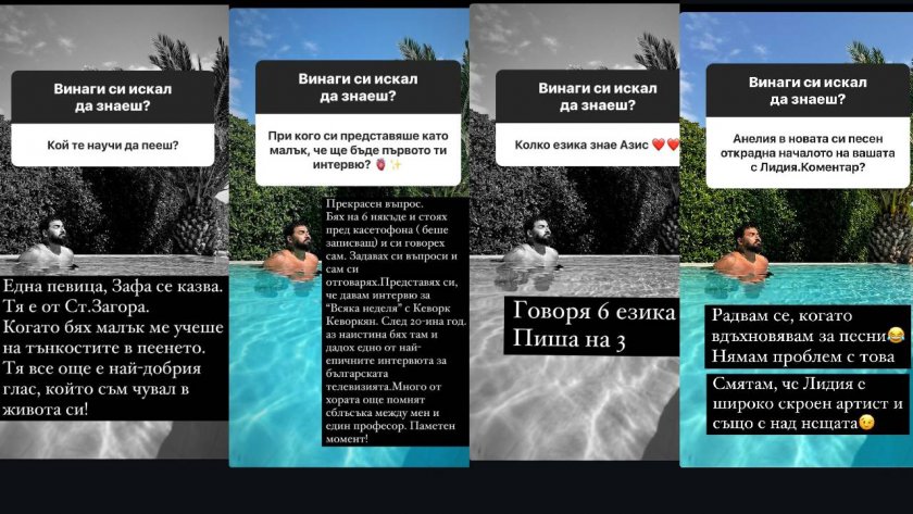 Освен това Кралят на фолка се оказа и полиглот. По думите му той владее устно 6 и документално цели 3 езика. Азис разяснява и обвинявания на собствен обожател към Анелия, че е заимствала в своя ария част от негово парче с колежката му Лидия. „ Радвам се, когато въодушевявам за песни. Нямам проблем с това. Смятам, че Лидия е необятно скроен актьор и също е над нещата “, споделя попфол артистът.