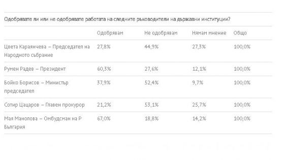 През октомври най-одобрявани са министрите: Томислав Дончев (с 37% одобрение), Красимир Карачанов (с 35% одобрение), Красен Кралев (с 33% одобрение), Лиляна Павлова (с 28% одобрение), Екатерина Захариева (с 28% одобрение) и Владислав Горанов (с 27% одобрение).