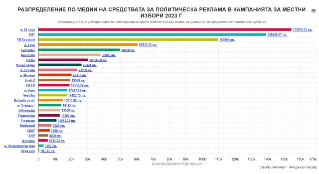 На първо място по разходвани средства се оказва в. „ 24 часа “, където обединенията са насочили 154 783 лева Вестникът е предпочетен както от парламентарно показани обединения като, „ за България “, ПП-ДБ, по този начин и от по-малки и нови субекти.