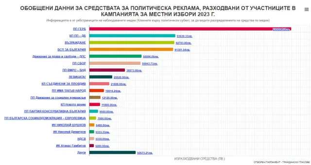 Най-много средства за реклама са отделили парламентарно показаните обединения. Първи са партия с 220 005 лева без Данък добавена стойност. С малко под 100 000 лева ги следва обединението ПП-ДБ с 93 630 лева, „ “ с 92 703 лева и за България с 91 386 лева