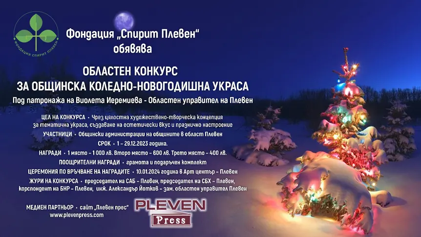 В интервала 1 - 29-ти декемврисе провеждаОбластен конкурс за коледно-новогодишна декорация на общините под патронажа на регионалния шеф на Плевен Виолета Иеремиева.