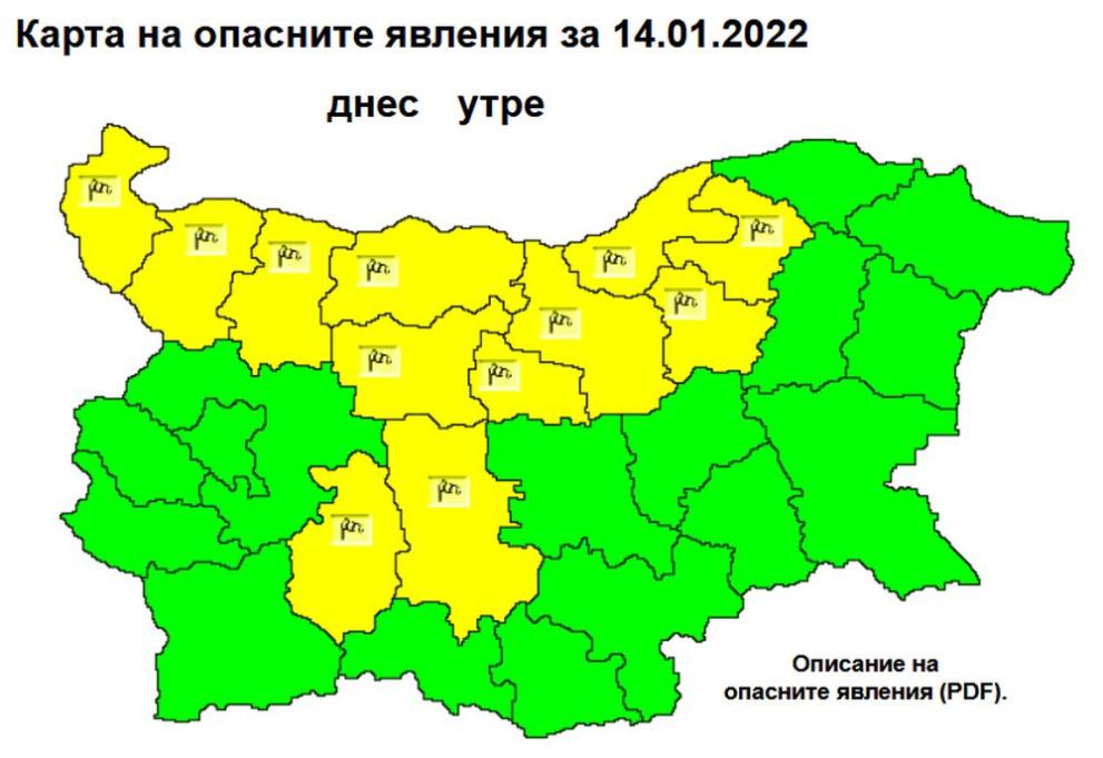 За 14 януари е разгласен жълт код за мощен вятър в 12 области у нас. Силен вятър с пориви до 20 m/s ще има в областите Пазарджик, Пловдив, Видин, Монтана, Враца, Плевен, Ловеч, Габрово, Велико Търново, Русе, Търговище и Разград.