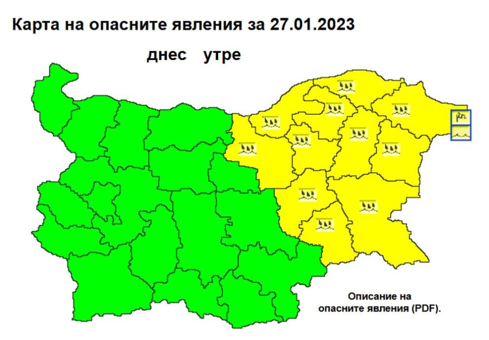 В петък жълт код за обилни превалявания от дъжд с количества към 20-30 mm е разгласен в 11 области. Предупреждението за евентуално рисково време е в действие за областите Ямбол, Бургас, Сливен, Велико Търново, Русе, Търговище, Разград, Силистра, Шумен, Варна, а в област Добрич с изключение на за превалявания предизвестяват и за мощен вятър и неспокойствие на морето.