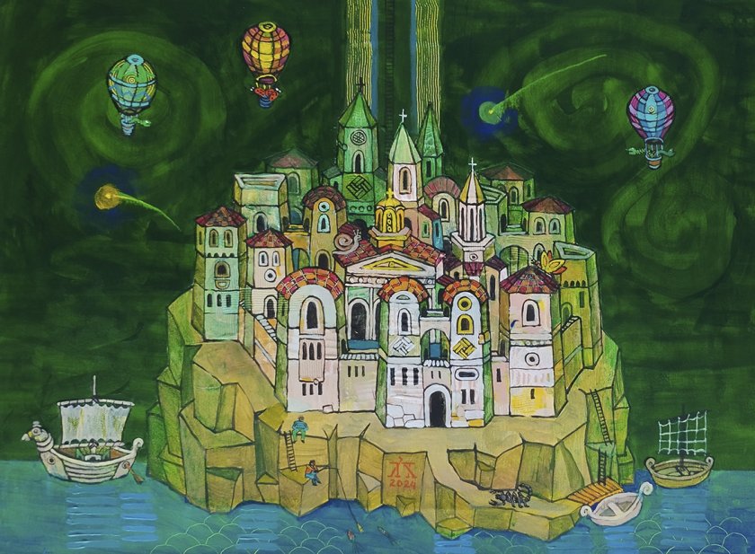 Чрез директния пластически език диря днешния образен облик на старите притчи в средновековните градове, в античните натюрморти и митичните кораби-риби. Картините ми изобилстват от ярки багри, фигури, знаци и предизвикат наблюдаващия към размисъл ", споделя проф. Пламен Легкоступ.