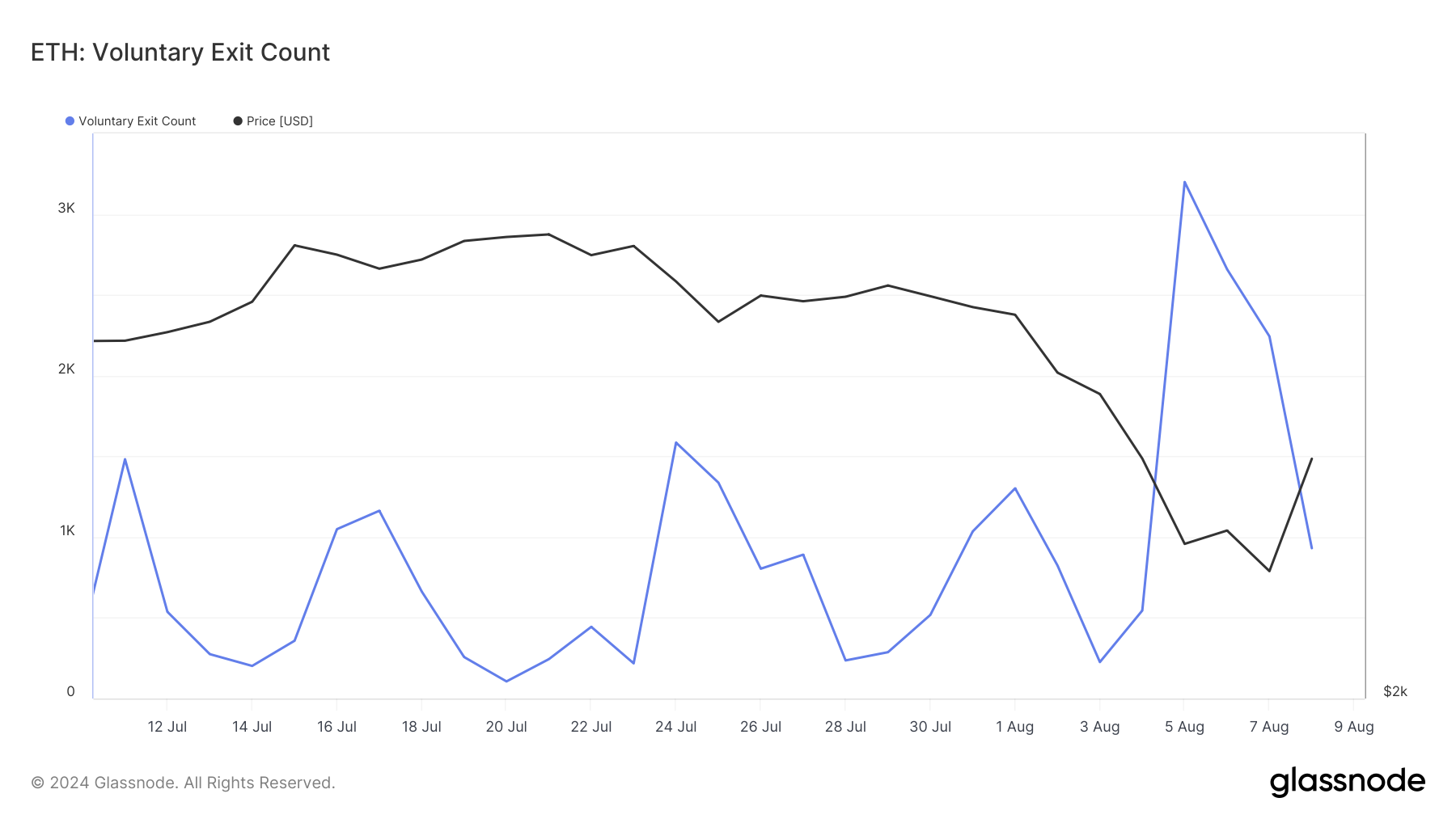 Цената на ETH спадна до седеммесечно дъно към $2,100, само че по-късно се възвърне. През този интервал 3,199 валидатори напуснаха Етериум мрежата, което е най-големият брой за един месец, евентуално заради неустойчивостта на пазара и спада в цената на алткойна.
