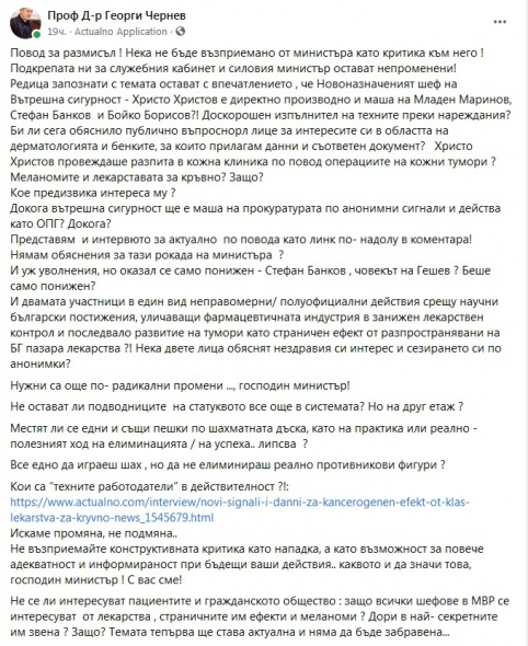 За въпросния документ, който беше началник на кожната клиника на Министерство на вътрешните работи болница, само че беше уволнен по абсурден метод дисциплинарно и в този момент казусът е в съда (). В своя обява в персоналния си профил във Facebook проф. Чернев пита дали " подводниците на статуквото " остават в системата, акцентирайки, че предшественикът на Христов – старши комисар Стефчо Банков, не е уволнен, а единствено намален. Специално за Христов, проф. Чернев изрича мнение, че той е мощно обвързван с Министерство на вътрешните работи министъра от времето на третия кабинет на Бойко Борисов – Младен Маринов. Припомняме, че Маринов беше една от жертвите на чистката в третото държавно управление на Борисов при огромните митинги от лятото на 2020 година, само че по-късно отиде на челно място И пита – за какво шефове в Министерство на вътрешните работи се интересуват от бенки? Отговорът, съгласно проф. Чернев, можете!
