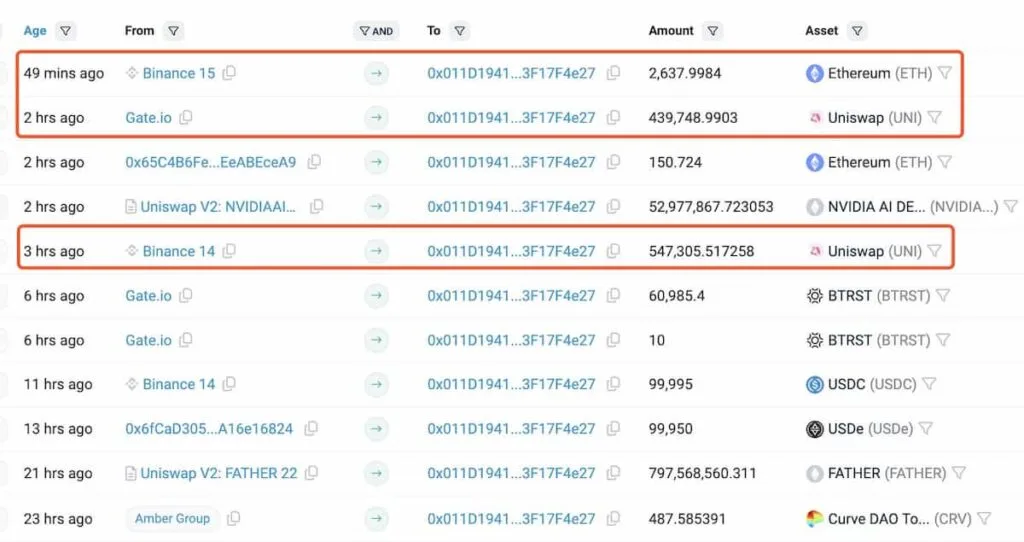 Въпросният адрес, “ 0x011d19410fc79f140c08ffa8301e4153f17f4e27 “, обвързван с Amber Group, изтегли 2,638 ETH от Binance, което съгласно данните на Lookonchain е на стойност $9.165 милиона. Uniswap токените бяха засечени посредством две огромни тегления: 547,305 UNI от Binance и 439,749 UNI от Gate.io. Общо бяха получени 987,054 UNI на стойност $10.6 милиона.