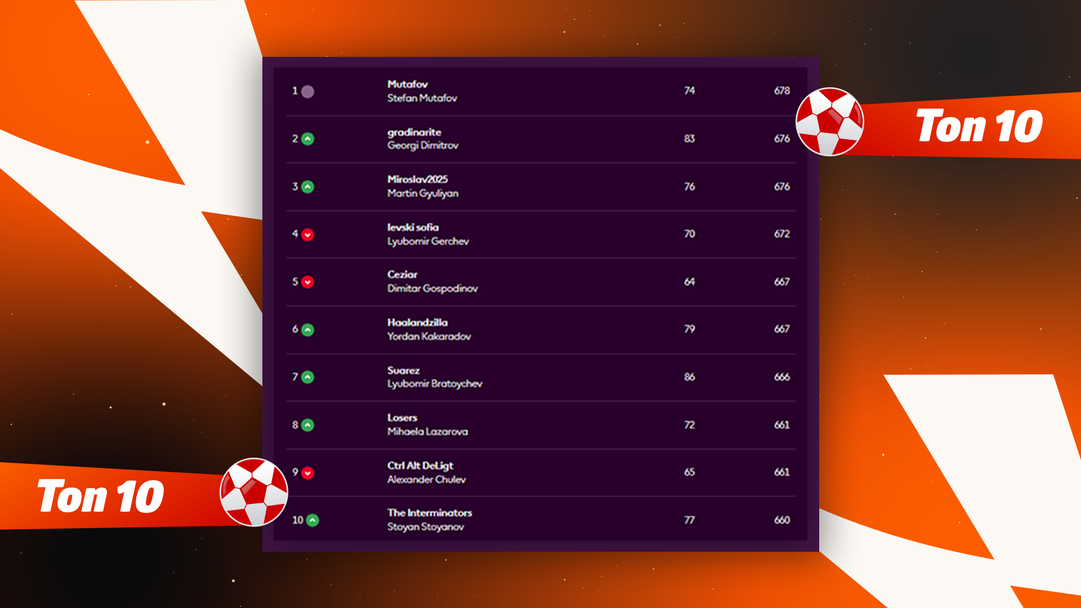 Гост в студиото беше Миро Попмарков – човек, отдален на детско-юношеския футбол и водеща мощ в предаването „ Лигата на гениите “ . Той показа своя взор към построяването на млади играчи и пожела в даден миг да селектираме играчи във фентъзи тимовете си в Премиър лийг с някои от младите български гении. Иначе тематиката за капитанската лента още веднъж беше централна. " По-добре Халанд капитан даже против Ливърпул, в сравнение с да търсиш друго решение и след това да съжаляваш. Далеч по-голям риск е да се довериш на различен състезател вместо Холанд ", счита Миро Попмарков. В предаването припомнихме и какво се случва в борбата в мини-лигата на Sportal.bg , където присъединяване е отворено, само че единствено един ще приключи на върха. Голямата премия остава непроменена – истинска фланелка на обичания тим от Премиър лийг за спечелилия в края на сезона. Засега първата позиция е окопирана от Стефан Мутафов, само че преднината му е дребна, както можете да видите и в графиката с топ 10 на мениджърите.
