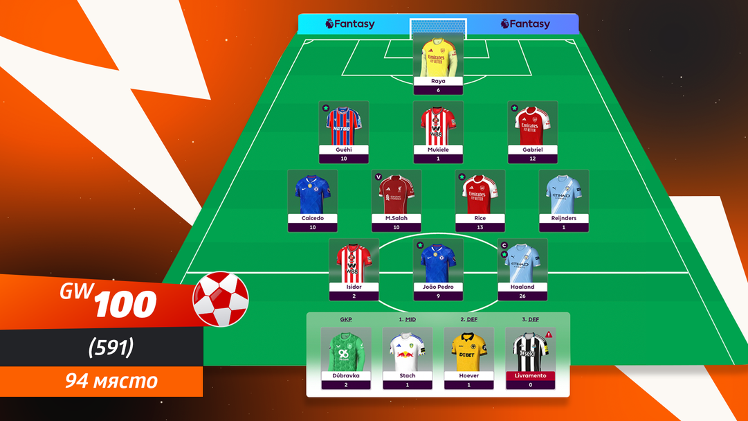 Седмицата беше запаметяваща се и за Алекс, който в формалната игра на FPL осъществя тъкмо 100 точки – резултат, който не се вижда постоянно даже измежду опитни мениджъри. Това му разреши да се изкачи съществено в общото класиране и да затвърди позициите си в лигата.
