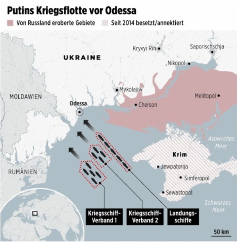 В пристанищния град Одеса в Южна Украйна нарастват опасенията, че Владимир Путин може да подреди на флота си да нападна. Сателитните изображения демонстрират минимум 14 кораба на съветския флот, които пътуват или се насочват към града (един милион жители) в Черно море. „ Операция Одеса “ може да стартира когато и да е.