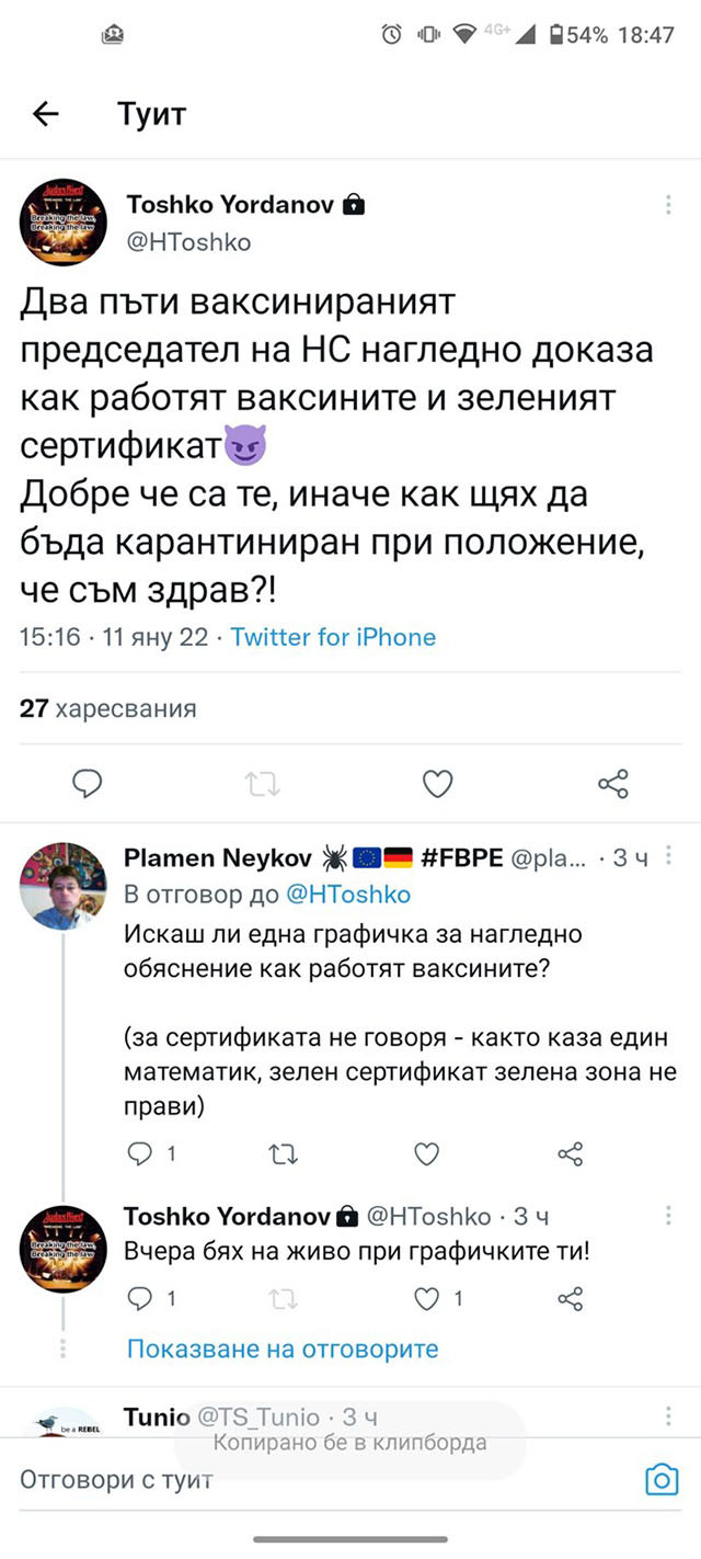 В агитация против имунизациите за COVID-19 трансформира разболяването на ръководителя на Народното събрание Никола Минчев зам.-шефът на " ИТН " Тошко Йорданов.