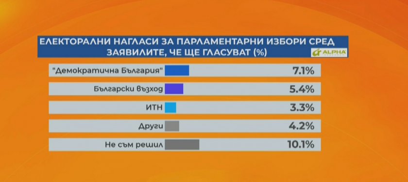 Има също усмиряване на възхода на " ". От една страна стабилизира позициите - ловко лавира сред присъединяване в ръководството и непрекъснати червени линии. Лявото русофилско пространство - " ", и поръчката за партия на разделят подобен електорат и " " стопира възхода си. Но при тях във всеки един миг може да има преливане на гласоподаватели от една към друга партия.