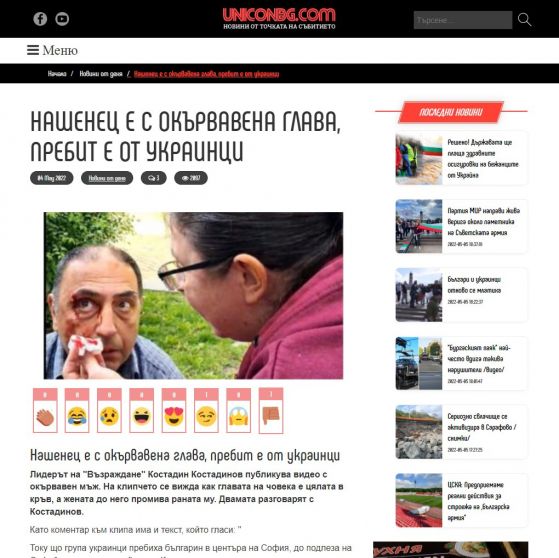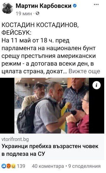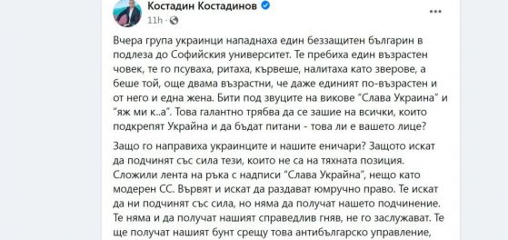 В обява в профила във Facebook на ръководителя на партия „ Възраждане “ Костадин Костадинов от 5 май, която е споделенa стотици пъти за няколко часа, в това число и от разнообразни медии, се твърди, че украинци са нападнали българин в подлеза до Софийския университет. В написаното се споделя " те пребиха един възрастен човек, те го псуваха, ритаха, кървеше, налитаха като зверове ".