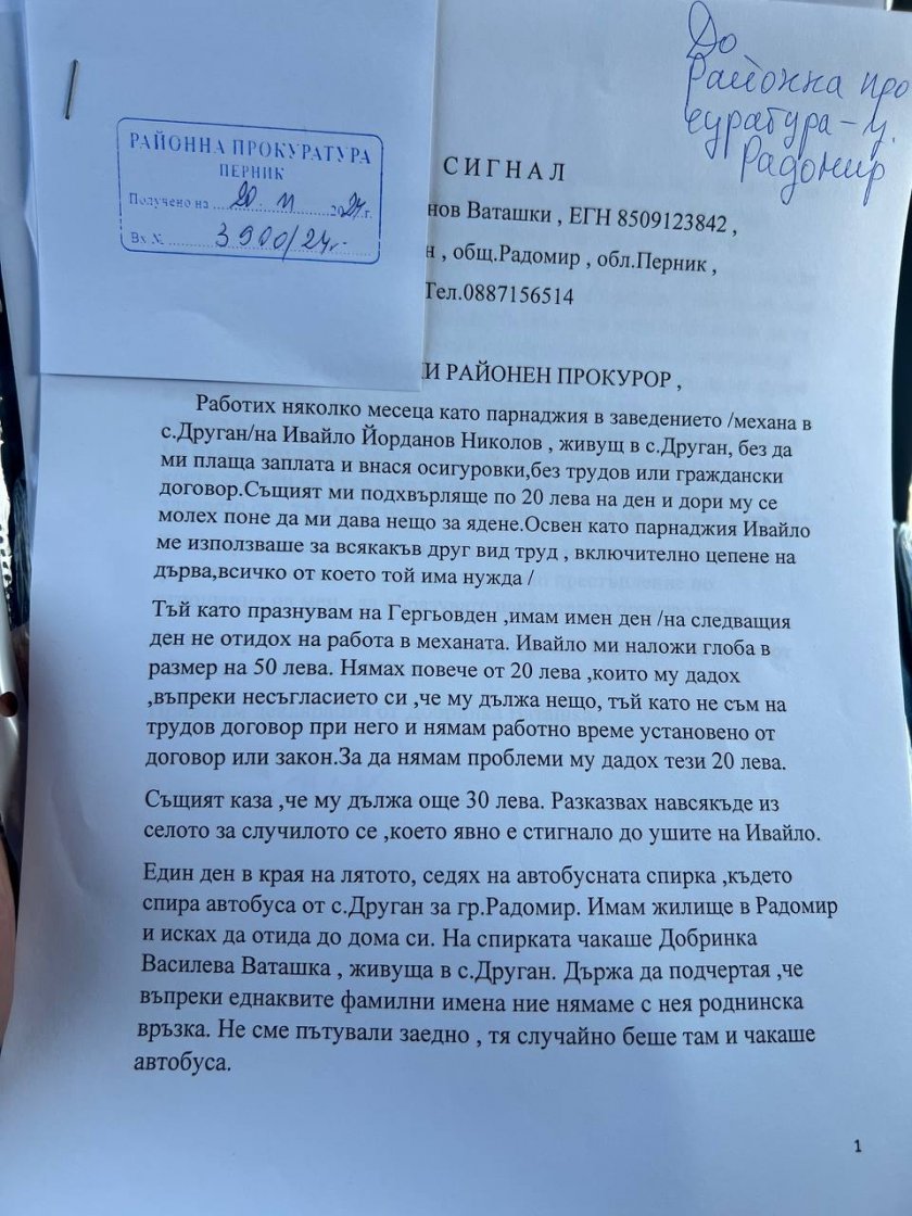 Жалбата беше изпратена до медията ни от юрист Елен Янкова. От Прокуратурата в Радомир потвърдиха, че през днешния ден е импортирана и чака систематизиране към прокурор.