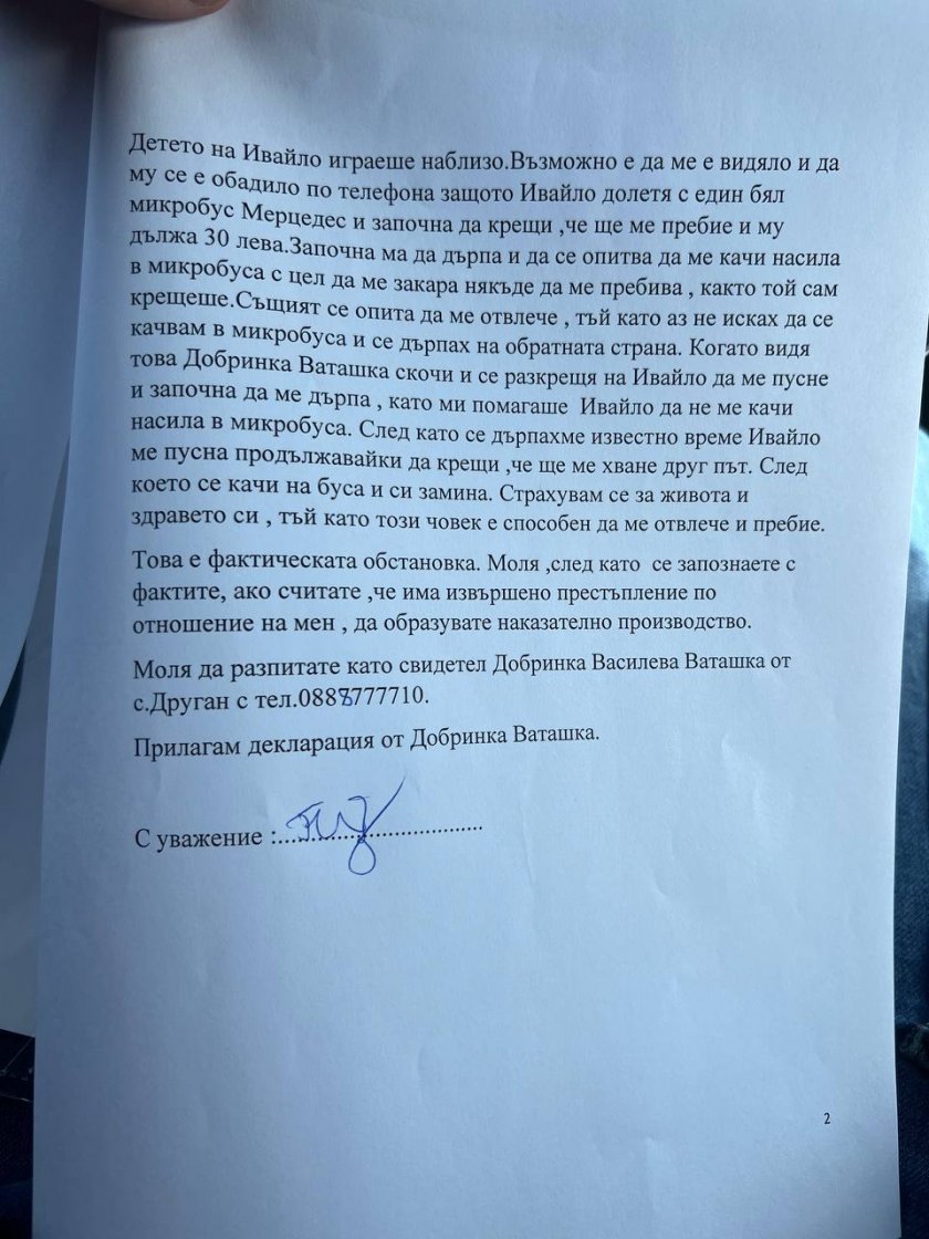 В жалбата млад мъж на име Георги Ваташки, които в документа твърди че няма никакви роднински връзки с семейството на Янко Ваташки, разказва по какъв начин е работил за Ивайло Николов. Изпълнявал длъжността " парнаджия " и получавал по 20 лв. дневно. Понеже на Гергьовден имал имен ден, на идващия ден не се е явил на работа. Заради това шефа му го глобил 50 лв.. Той имал единствено 20 и му ги дал. В жалбата написа, че след това Ивайло Николов пристигнал с бус и желал да отвлече и пребие Георги, с цел да си получи останалите 30 лв.. Това не се случило, тъй като там по случайност пристигнала майката на Янко Ваташки - Добринка. В сигнала до Прокуратурата Георги написа, че го е боязън от някогашния си началник.