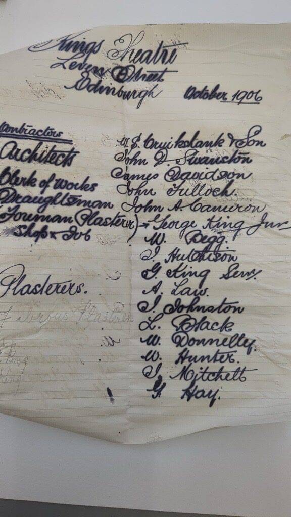 Това, което откриват, е лист с имена, започващ с Уилям Стюарт Круикшанк, строителят, който стои зад Кралския спектакъл. Бележката е от октомври 1906 година – единствено два месеца преди зданието да отвори порти за публиката.