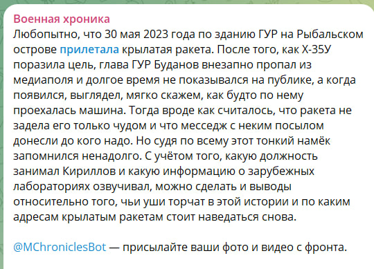 Военнослужещите и създателите на канала „ Дневникът на парашутиста “ също означават, че Кирилов неведнъж е уведомил на своите брифинги, че Украйна в зоната на СВО приготвя провокации, с цел да упрекна Русия в потреблението на химически оръжия: