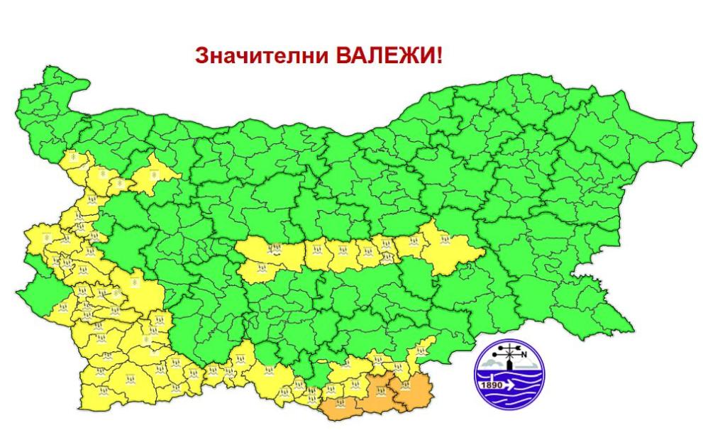 Оранжев код за рисково време и обилни превалявания от дъжд е разгласен отчасти в две области на страната - Хасково и Кърджали. Жълт код за евентуално рисково време и значителни превалявания от дъжд и сняг е разгласен в 11 области - Пловдив, Стара Загора, Сливен, Враца, Монтана, София област, София град, Перник, Кюстендил, Благоевград, Смолян. Частично е разгласен и за Кърджали и Хасково, само че единствено в Любимец, Стамболово и Маджарово.